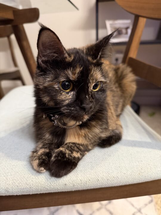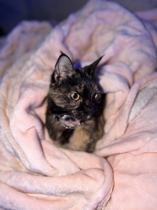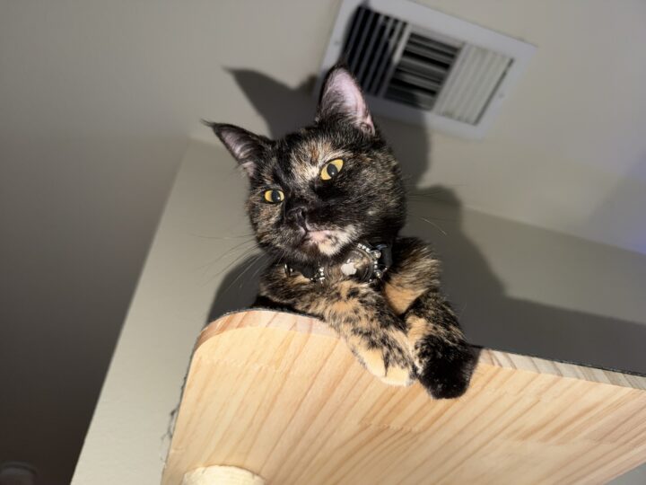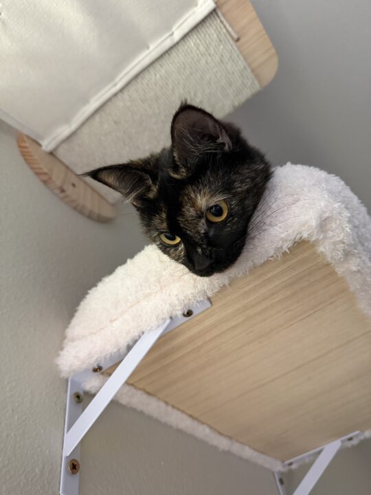 In January, Mike, one of SAFe’s morning cat care volunteers, adopted Molly, a one-year-old tortoiseshell. While not a kitten, Molly still has kitten-like energy when it comes to playing and asking for attention. She enjoys exploring just as much as bundling up in a comfy blanket! To make his living space cozy for her, Mike made a few adjustments…and it looks like Molly likes them.