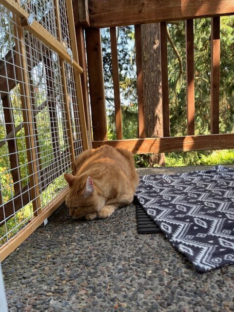 With his foster, Suzi, he had a whole catio to explore – so much so that she had to install a taller baby gate to keep him from climbing out.