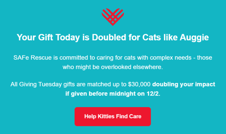 This Giving Tuesday, you can be the reason a cat’s life changes for the better. With more felines arriving in need of safety, care, and a second chance—and with growing demand for vital programs like our pet pantry and wellness services—your generosity makes an immediate impact. Your gift helps vulnerable cats move closer to the loving homes they deserve and ensures local pets stay healthy with the families who cherish them.
