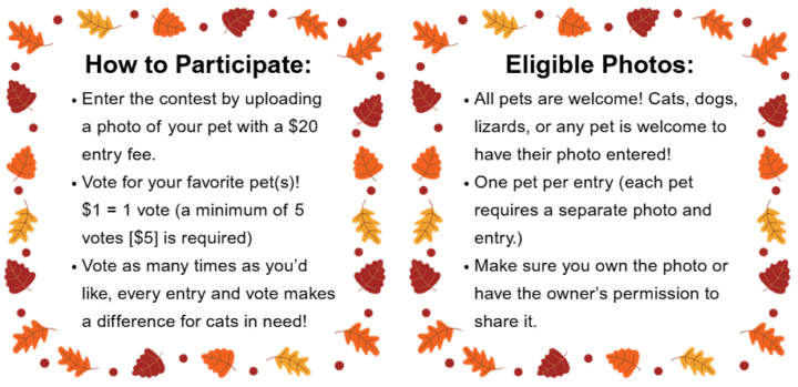 $20 per photo entry supports the kitties at SAFe Rescue. Votes are $1 each (minimum $5), and each entry starts with 5 votes! Contest runs Oct 7–30, winners announced Oct 31st.