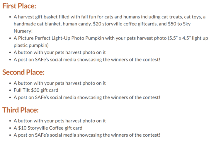 The top-voted pet will receive a custom pumpkin featuring their photo, a harvest basket filled with treats (for humans and kitties!), and a spotlight on SAFe’s social media. Not to mention serious bragging rights!