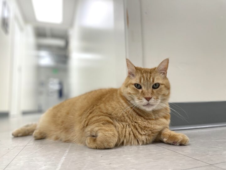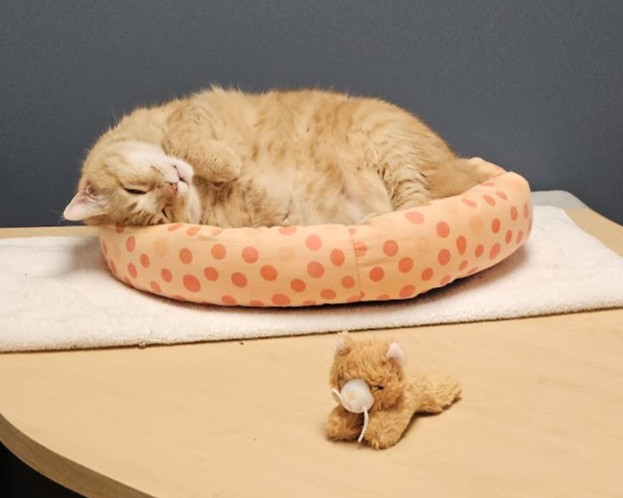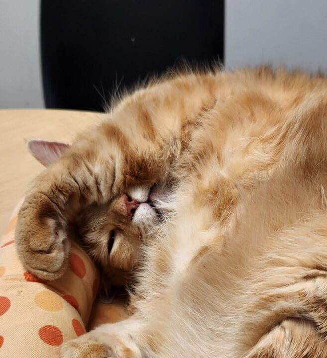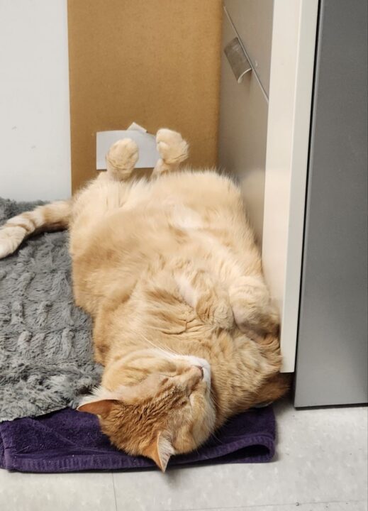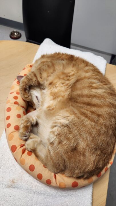 But when he starts purring, wheezing often follows. He begins to make high-pitched croaks and will excuse himself to lie down. Though we have a name for this condition—laryngeal dysfunction—our medical team still hasn’t uncovered why purring triggers this response. Even after multiple x-rays and veterinary exams, the exact root of Goldie’s breathing difficulty remains a mystery.